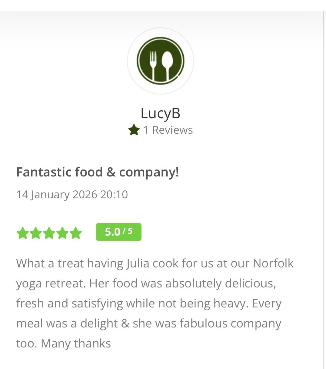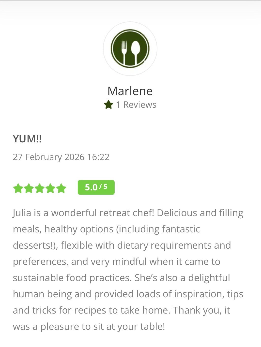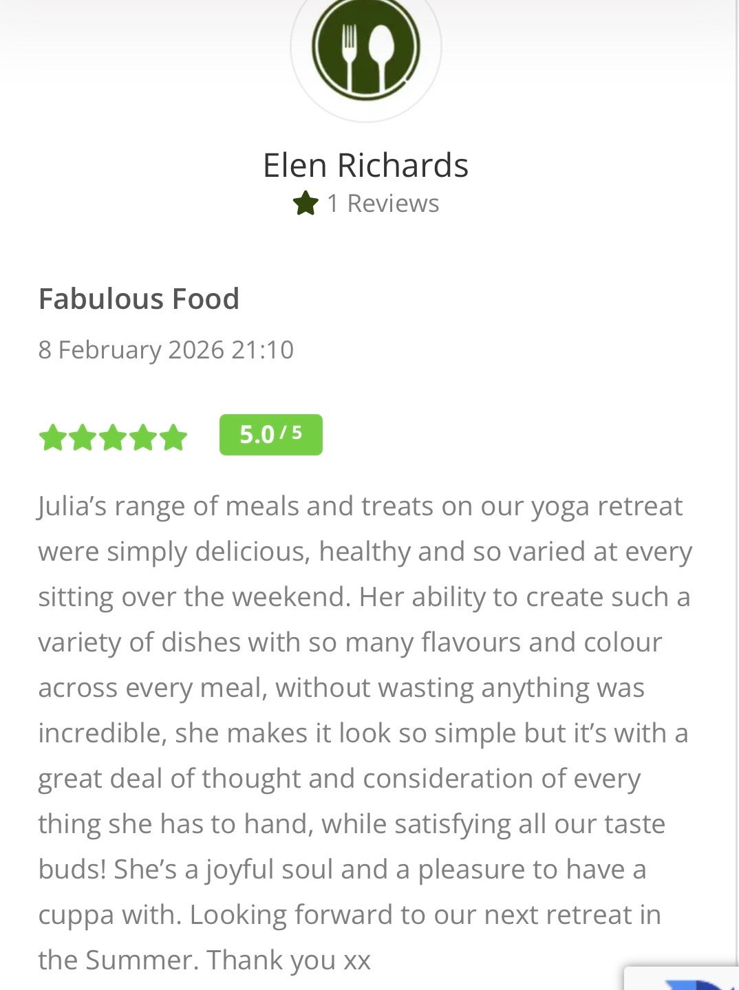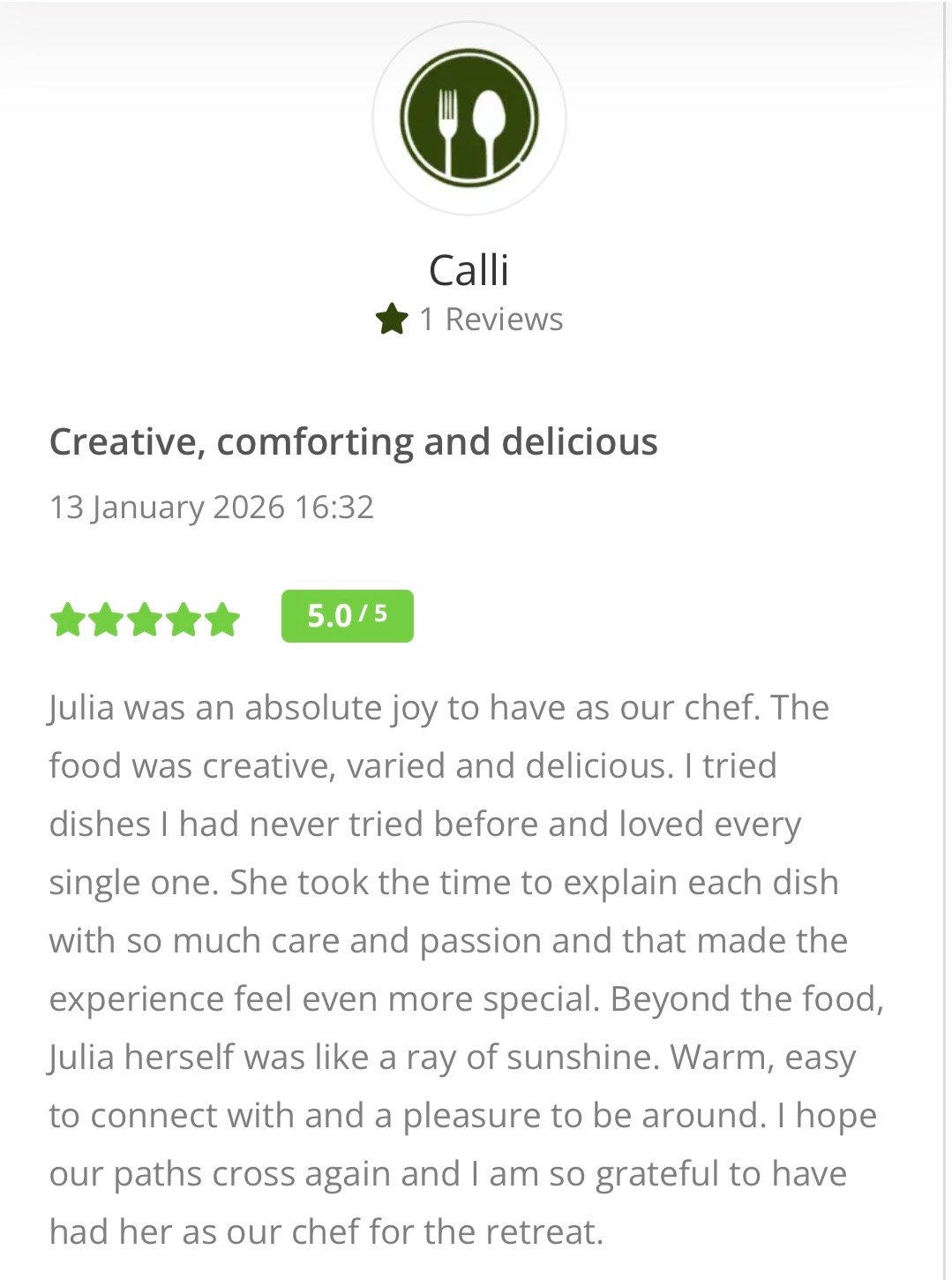 Please meet Julia who is listed as one of our retreat chefs on the directory and has been getting rave review from her clients and guests alike.